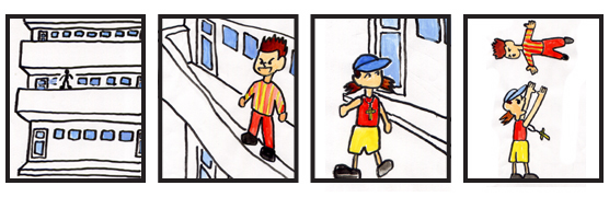 1.小学校のベランダのふちに立って遊ぶユウキ。